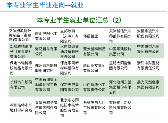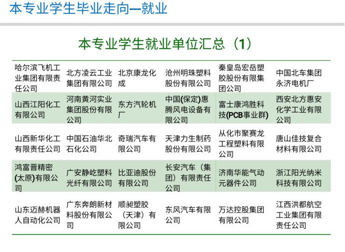 高分子材料与工程专业毕业生就业面广,可就业行业包括高分子材料生产加工、石油化工、汽车制造、生物医药、精密仪器加工、能源材料以及教育科研等领域,近几年的就业单位主要包括哈飞基团、北方凌云工业、比亚迪汽车、长城汽车、天津力生制药、立邦涂料、中石油等企业。高分子材料相关的科学研究在助力人工智能、5G建设、医疗防护等领域发挥着这关键的作用,很多本科生也选择毕业继续深造,近年来高分子专业的应届考研率保持在41%以上,主要去向包括中科院化学所、北航、川大、北化、天大、哈工大等。综合考研和就业,专业的一次就业率一直保持在95%以上。欢迎全国考生报考华人直播