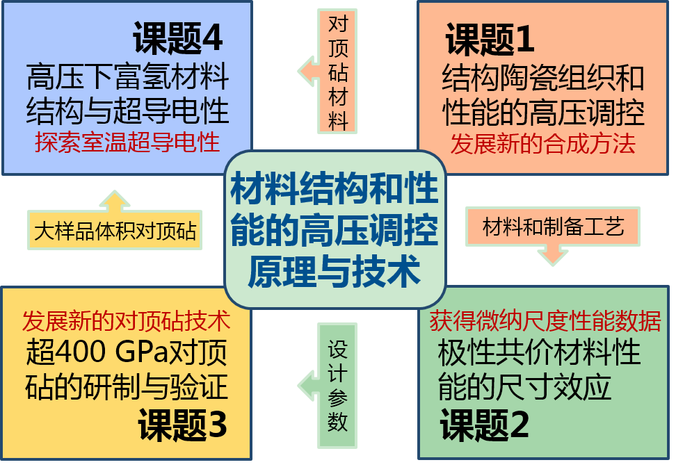 该项目联合吉林大学、广东工业大学以及浙江大学共同承担,分为四个课题,分别由我校田永君院士、聂安民教授、王霖教授以及吉林大学马琰铭教授承担,项目资助直接经费1792万元,执行期5年。项目围绕解决金属氢和室温超导电性两个重大科学问题对超高压技术和压砧使用材料的迫切需求,拟发展全新的高压调控策略—形变孪晶方法,制备出超高硬度、高韧性(高塑性)的纳米孪晶金刚石材料,获得材料在微纳尺度下力学性能数据,设计并研制出最高压强大于400GPa的纳米孪晶金刚石对顶砧,并用于探索高压下具有室温超导转变的新型氢化物。此外,将形变孪晶等调控策略和科学原理用于解决部分陶瓷材料的脆性问题,力争发展出高韧性/高塑性的结构陶瓷。