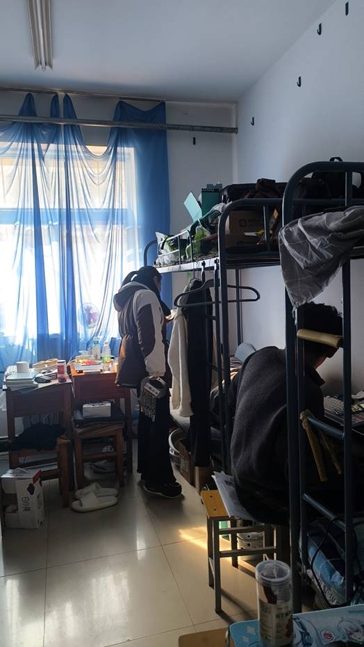 走访人员重点排查电动车及电池进入寝室和楼道、门厅;在宿舍内使用电加热设备和超功率电器;在门厅走廊、消防通道等公共空间违规堆放杂物;在宿舍、卫生间等区域吸烟和使用明火等行为。及时消除无人寝室未切断电源开关、未关灯以及未锁门等安全隐患,同时记录在册并告知相关寝室的同学。对整体情况优良寝室提出表扬。