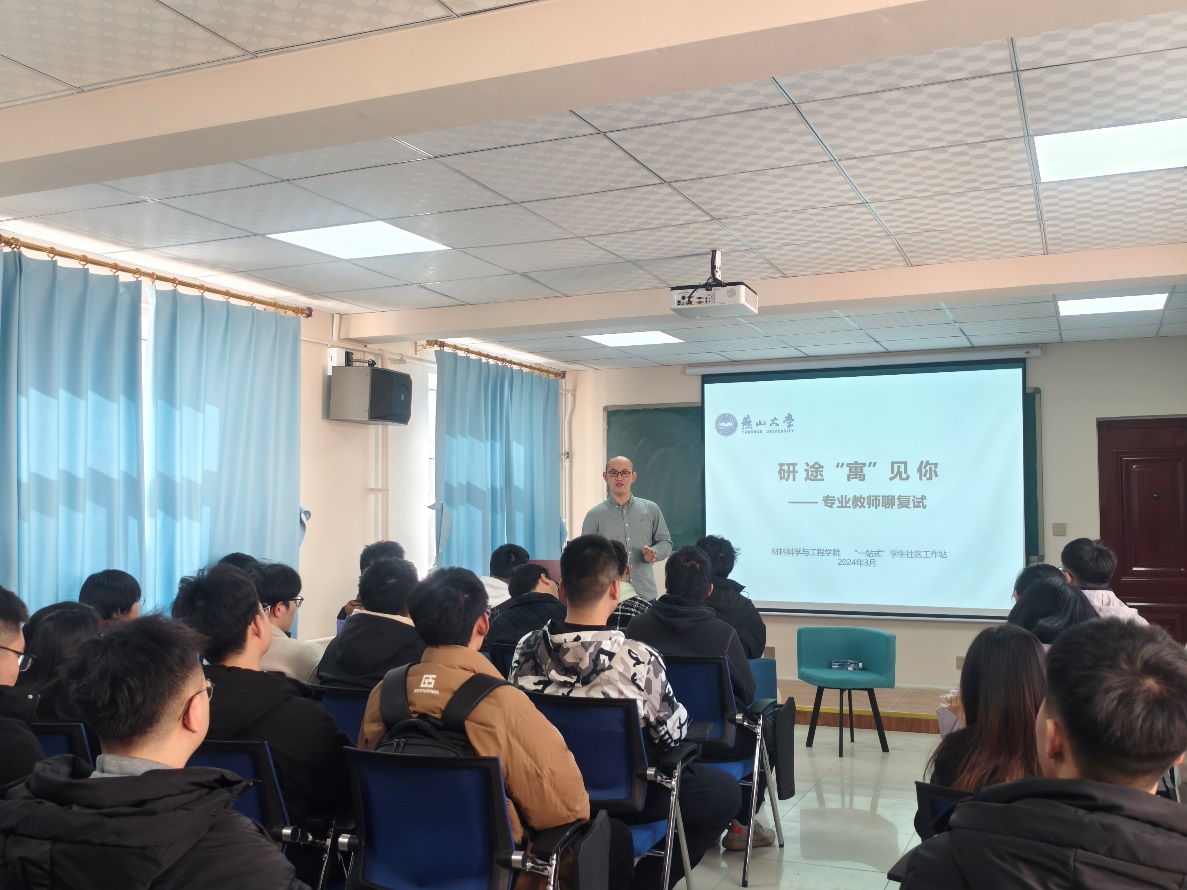 高分子材料与工程系主任张振琳首先强调面试时自信的重要性,复试时面试教师重视专业知识底子,提问时会关注学生对知识理解的深度,学生回答问题时应实事求是,不卑不亢。希望大家结合自身情况做调剂选择,同时鼓励班内同学互相帮助、搜集关注相关信息。