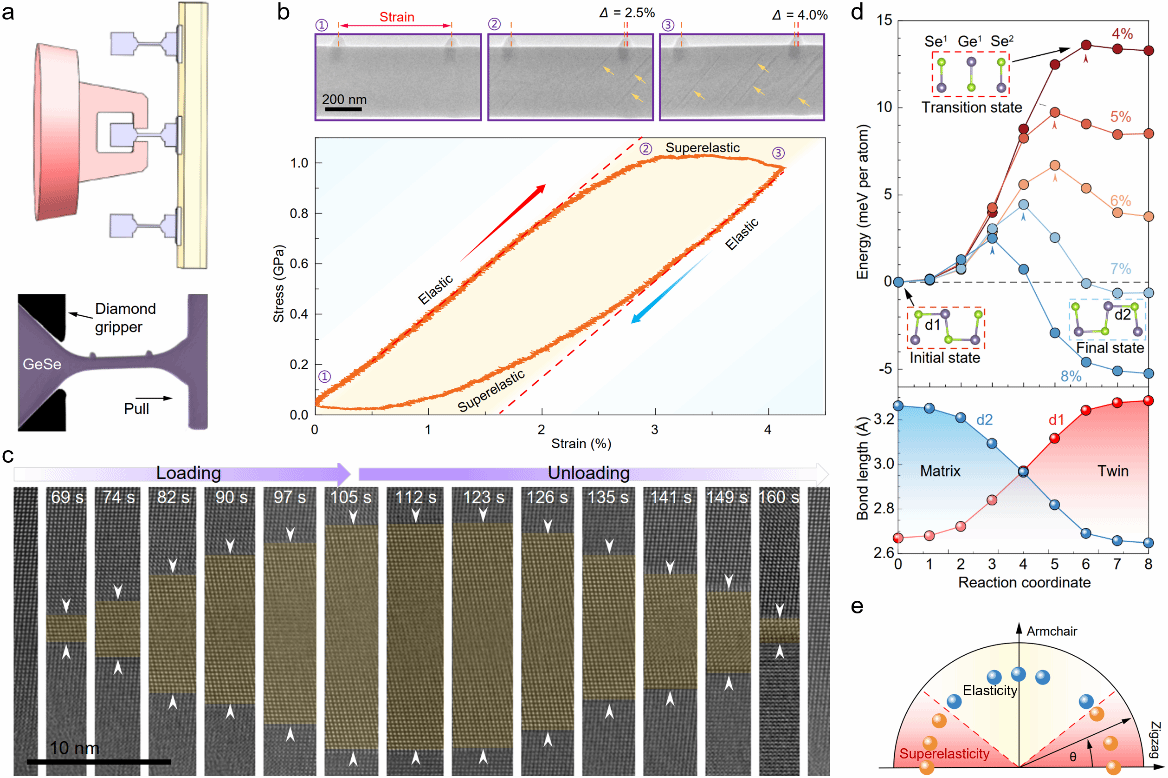 (a)GeSe拉伸试验;(b)加载卸载应力-应变曲线及孪晶畴形成;(c)高分辨透射电镜观察到的孪晶畴演化;(d)不同应变下孪晶转变的能量和键长变化;(e)超弹性出现的角度范围