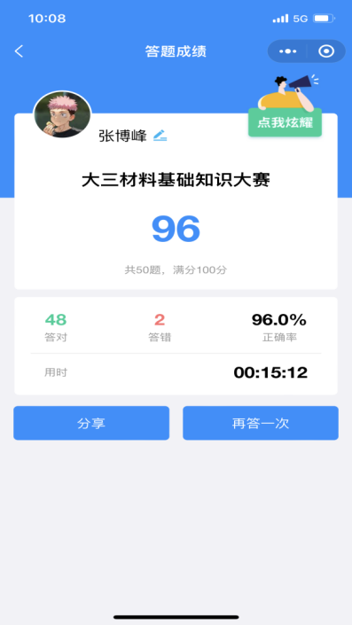 参赛者扫描二维码加入活动群,详细阅读群公告了解活动规则。比赛进行阶段,本次比赛匹配各年级学习水平合理组建4套试卷,并邀请专业教师对赛题进行把关,以科学考察参赛者对材料学科的知识掌握水平。每名参赛者有且仅有一次答题机会,需在30分钟内回答比赛中的50道题目,经过统计,各年级的平均分均在75分以上。赛后有同学表示,这种以赛促学、以赛促练的方式很好,有些题目确实涉及到了自身的知识盲区,会在今后的学习中多加学习。
