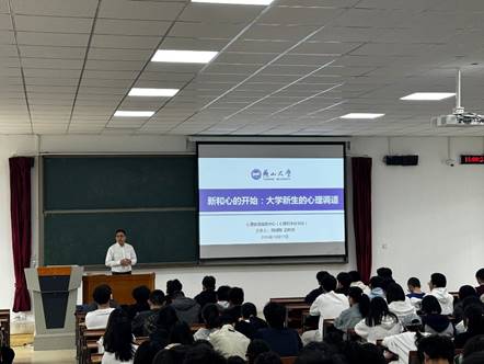 心理健康服务中心主任陶建刚主讲,学院党委书记王国伟和2024级新生一起参加并聆听了本次讲座。讲座由2024级研究生辅导员范学美主持。