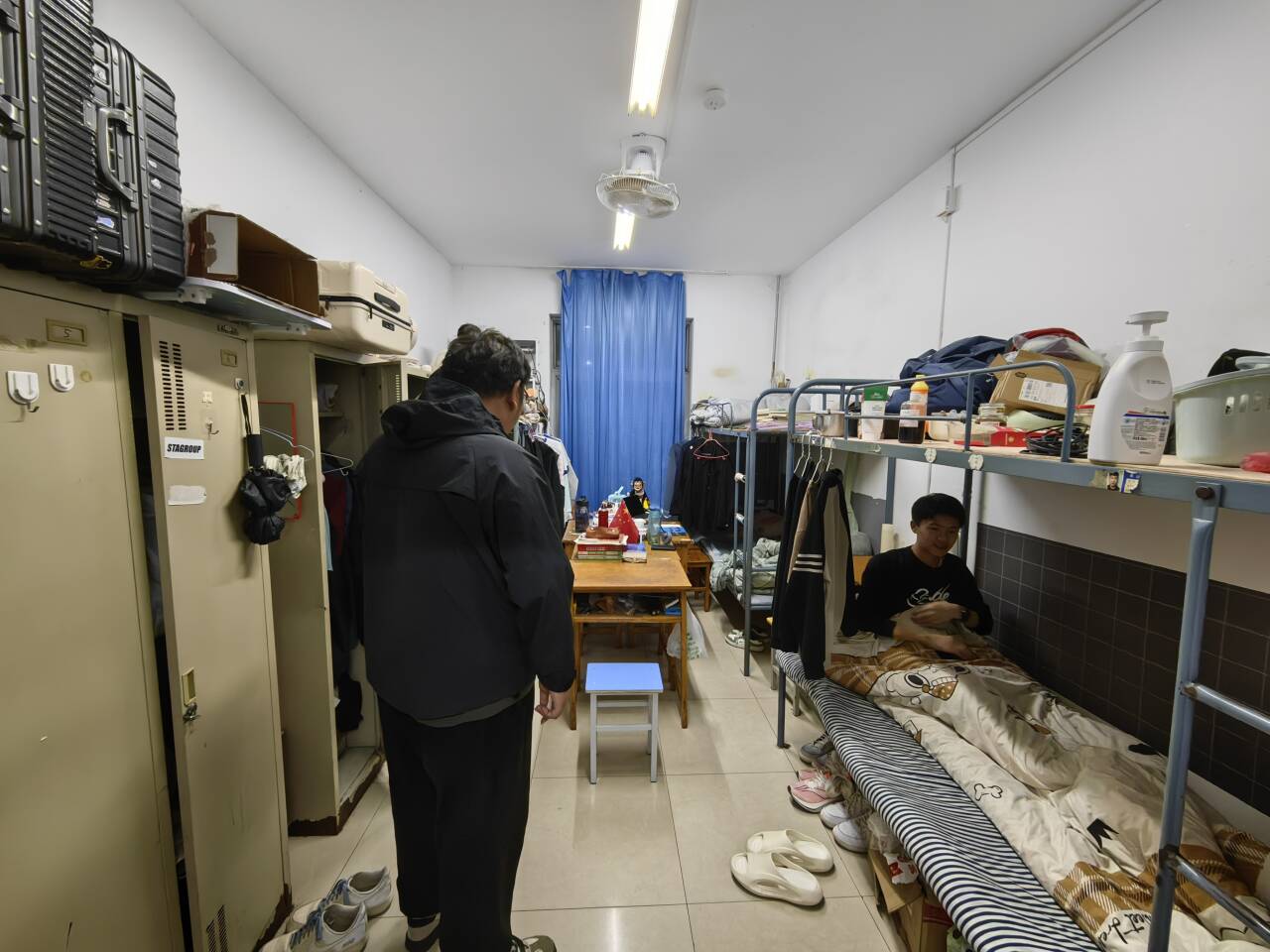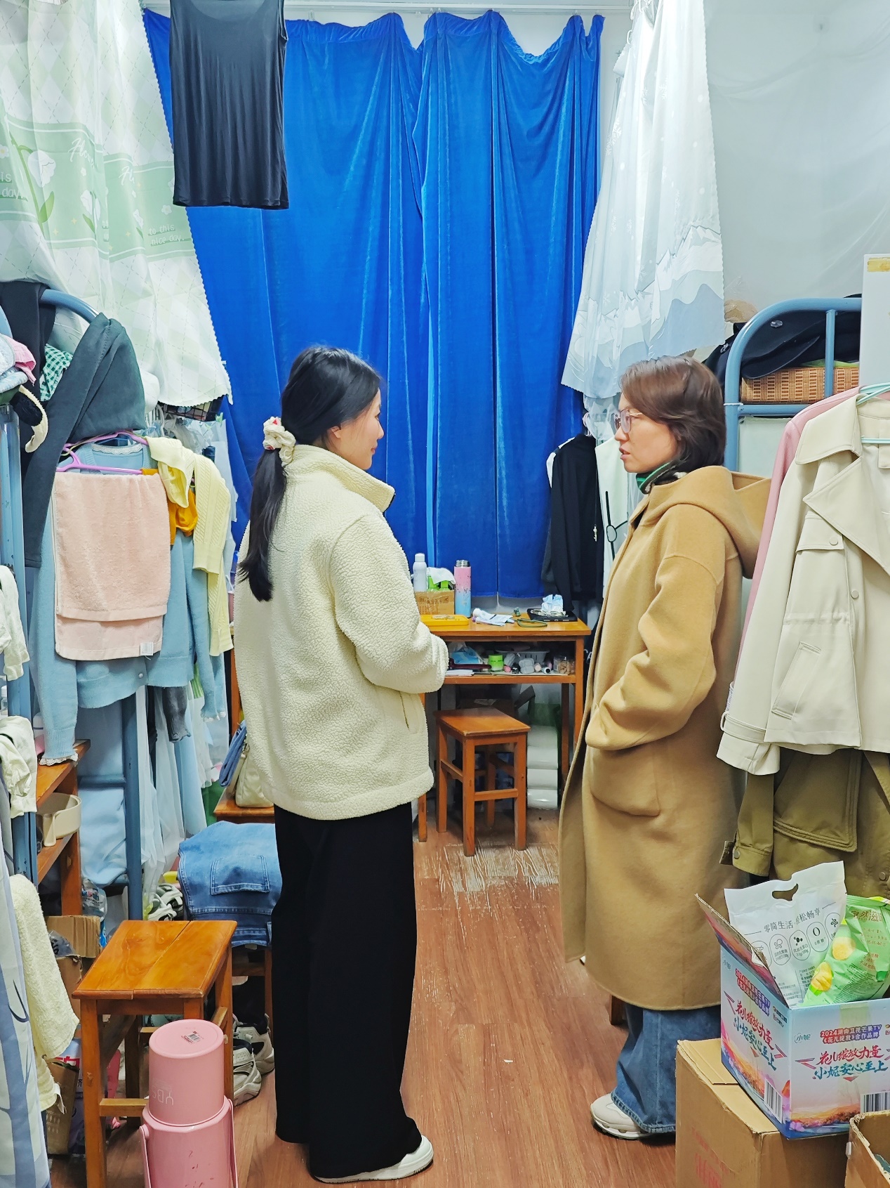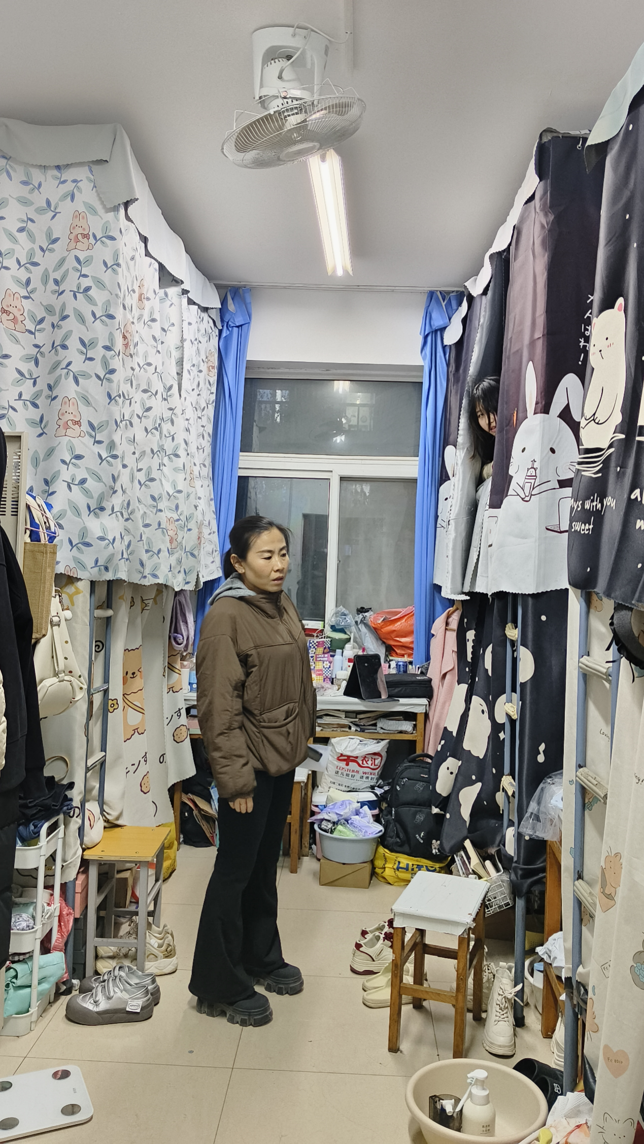 师生临时组建8支工作队,深入各组团学生寝室,以“地毯式排查+温情式服务”模式深入各学生组团。他们手持检查清单,重点开展三项核心工作:一是安全守护行动:逐间核查未归寝学生请假记录,现场演示安全用电规范,排查私接电线、违规电器等隐患,温馨提示寝室成员做到“人走断电”;二是文明共建行动:对照《华人直播