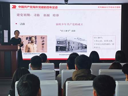 行政楼113会议室以《中国共产党海外党建的百年足迹》为主题,为学院24名发展对象和41名学生党员讲授专题党课。