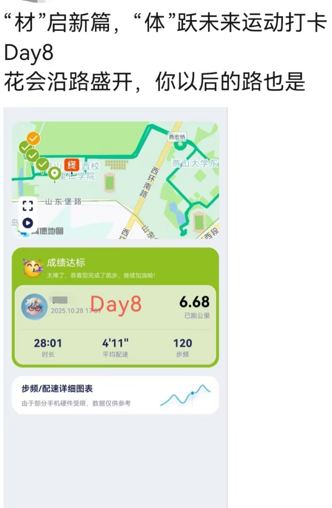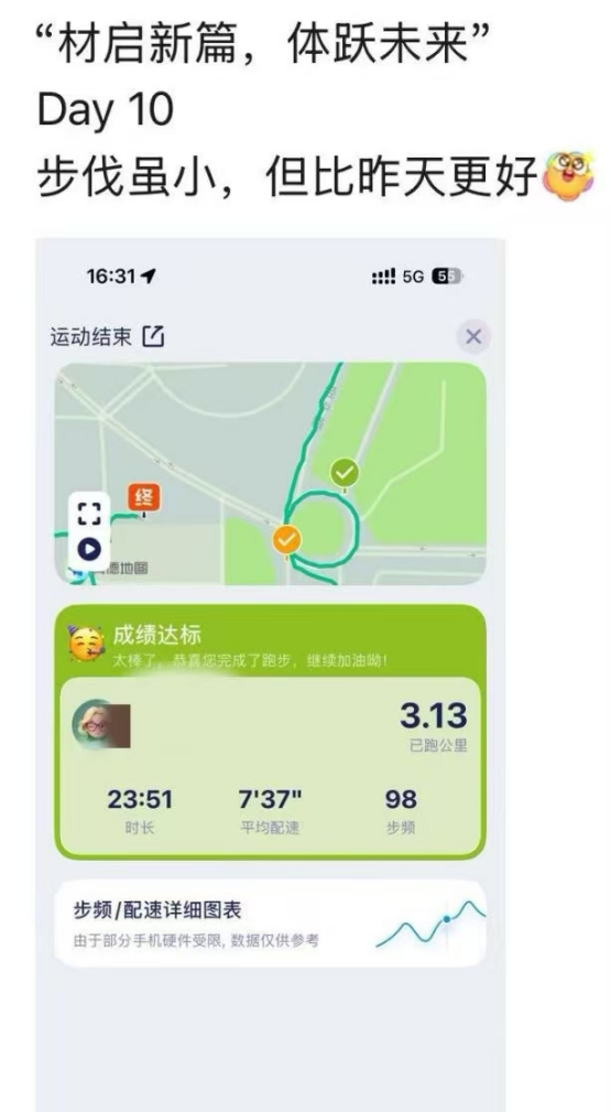 活动实施21 天校园跑计划,采用“17天线上自主打卡+4天线下集中打卡”的创新模式,吸引了全院数百名学生积极参与。学生们运动热情高涨。线上平台洋溢着坚持的成就感,学子们纷纷分享跑步瞬间与配速突破。同学们在奔跑中踩碎寒意、挥洒活力,展现出材料学子拼搏向上的精神风貌,切实将“以体育人”融入日常。