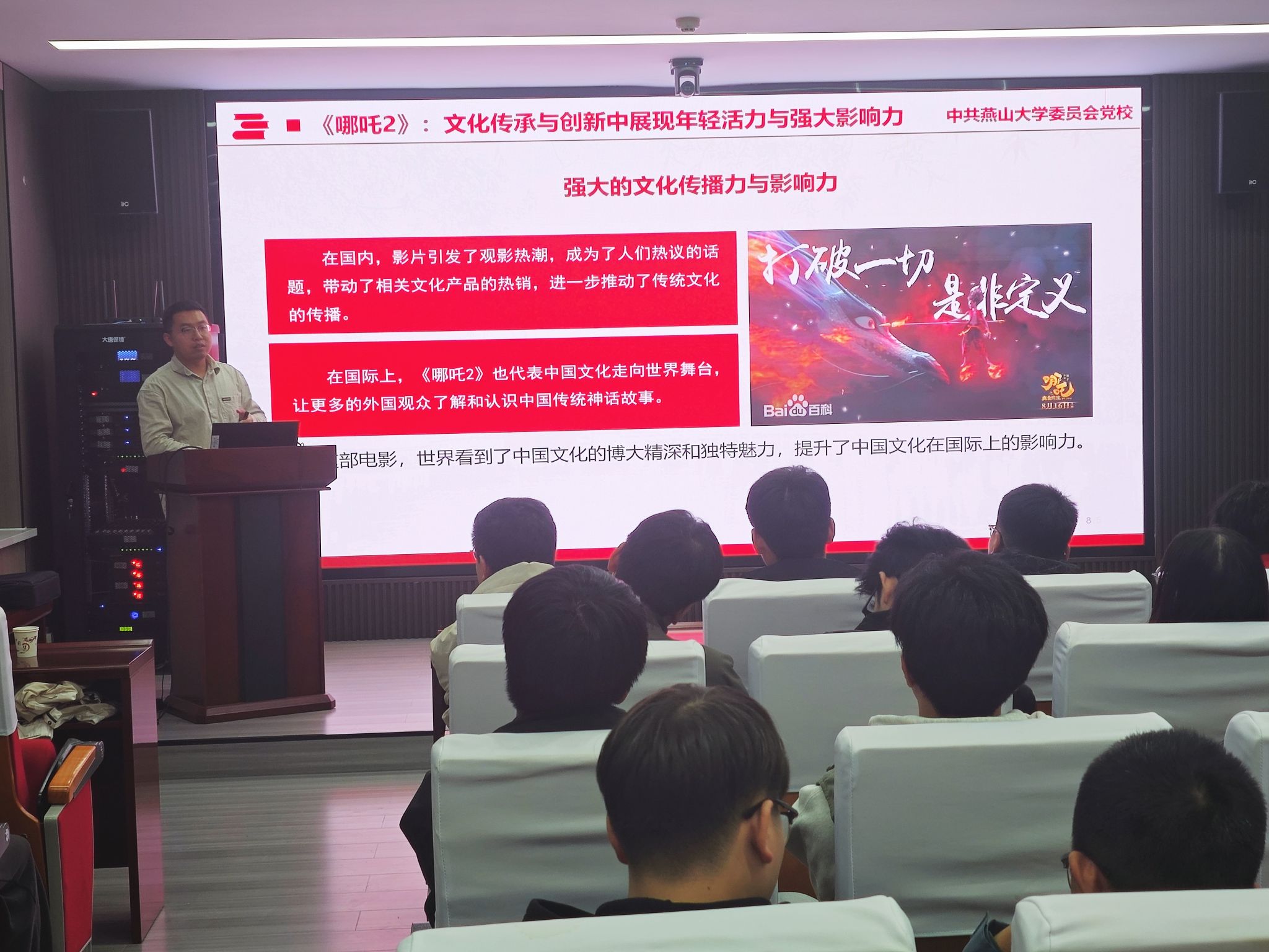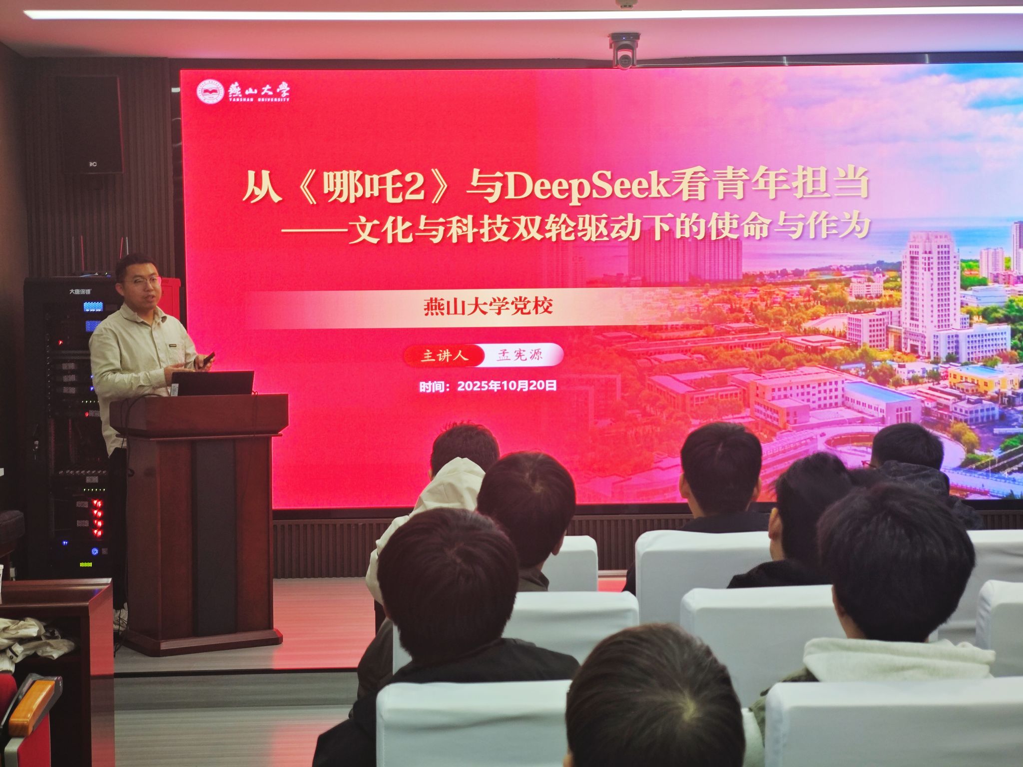 分党校邀请信息科学与工程学院孟宪源老师在学院办公楼113会议室,开展《从<哪吒2>与DeepSeek看青年担当-文化与科技双轮驱动下的使命与作为》专题党课,学院发展对象及学生党员共81人参加学习。