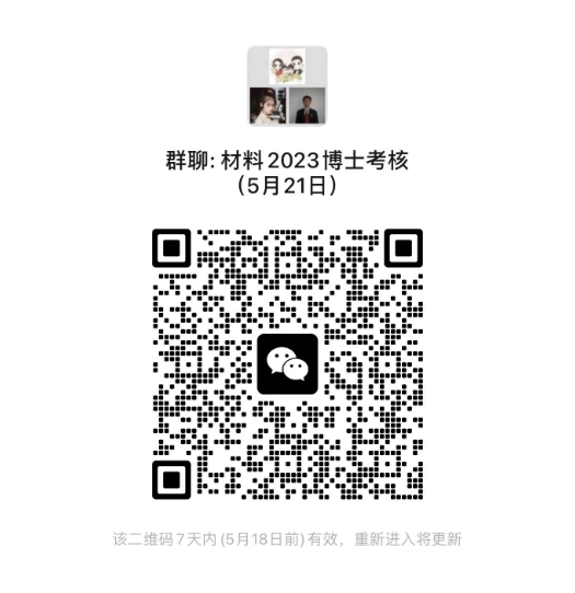 请报考考生加入微信群“材料2023博士考核(5月21日)”,具体考核时间地点安排群内通知。(2022年12月已考核过的硕博连读考生除外)