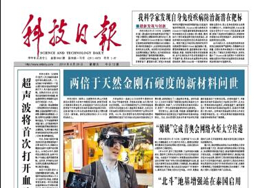 6月20日,《科技日报》头版头条对我院田永君教授团队在极硬材料合成研究领域再次取得的重大突破进行了报道。近日来,田永君教授团队的科研成果迅速在国内外引起强烈反响,连日来,已先后有美国《洛杉矶时报》、西班牙《阿贝赛报》、英国《化学世界》、《参考消息》、《中国科学报》、中央电视台《朝闻天下》、《河北日报》、人民网、新华网、腾讯网、新浪网、凤凰网等国内外媒体对该成果进行了密集报道。